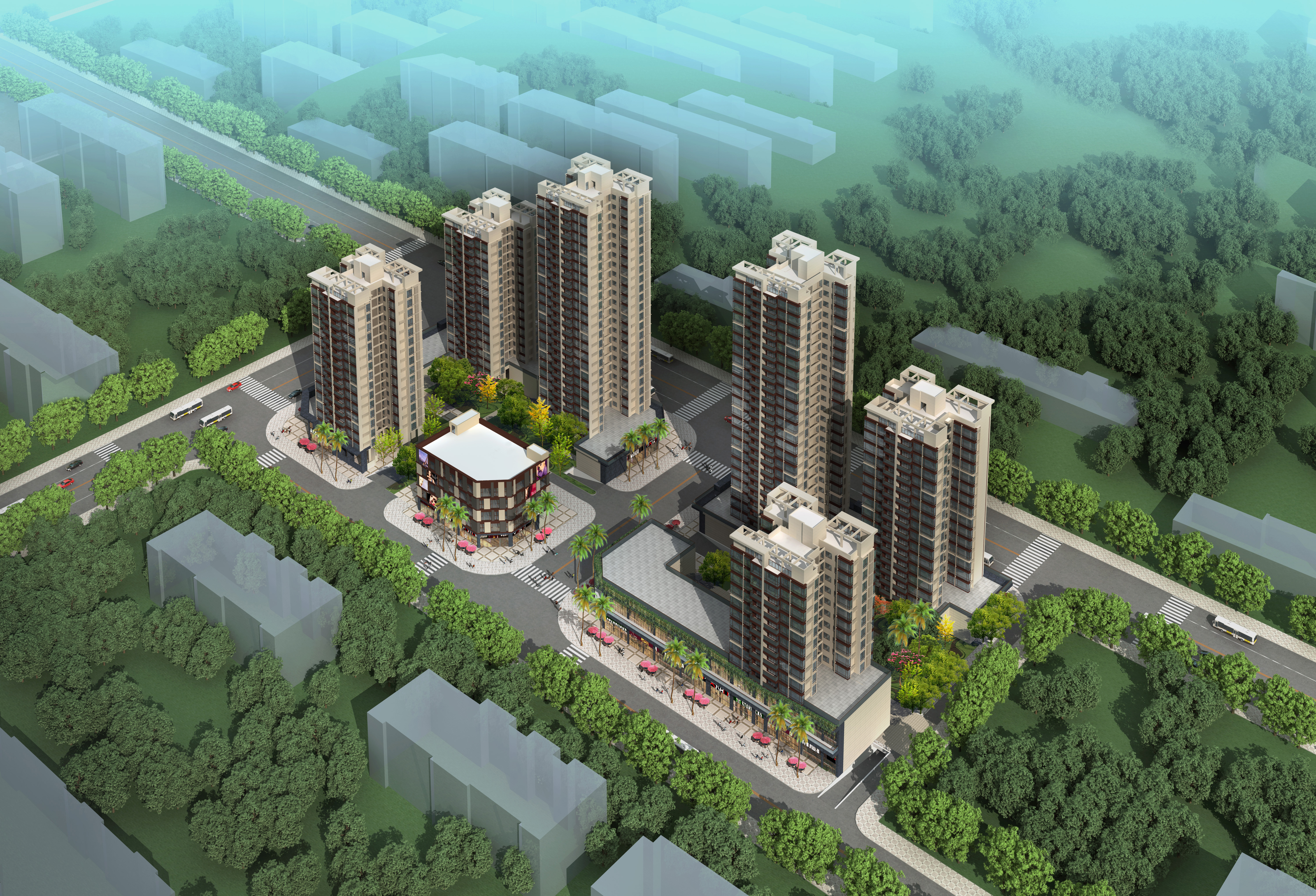 工程商業分佈在工程的四周,全部臨街,且工程一期二期之間也有市政道路隔開,並分佈有商業,形成內街,整體商業呈8字形,構成工程獨特的商業風情街易以將本計畫的商業打造成坦洲新行政中心另一個商業熱點街區。
